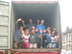 This is the result of a hard early morning’s work, loading our stuff onto the container which is now headed for Bristol from Philmont NY!! (via Southampton, UK)  We had Michael, My son and daughter-in law , Mark and Kristi, our Dog Dylan, our son August and his girlfriend Lauren, and Micah’s fiancee, Tor.  Not in the picture are Micah and me, two more hardworking women!