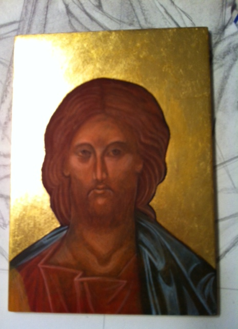 God is inspiring me to paint icons the way He is showing me now, and that is allowing me to evolve an individual style.  It is so exciting partnering with God – highly recommended way to go!  This small Christ study and the Saint Benedict icon are on the path to what I’m developing.  I  Can’t tell you how exciting that is to see where He will take it.   I feel the way my little granddaughter must have felt the other day on her first sled ride in Boston!   photo copy 5