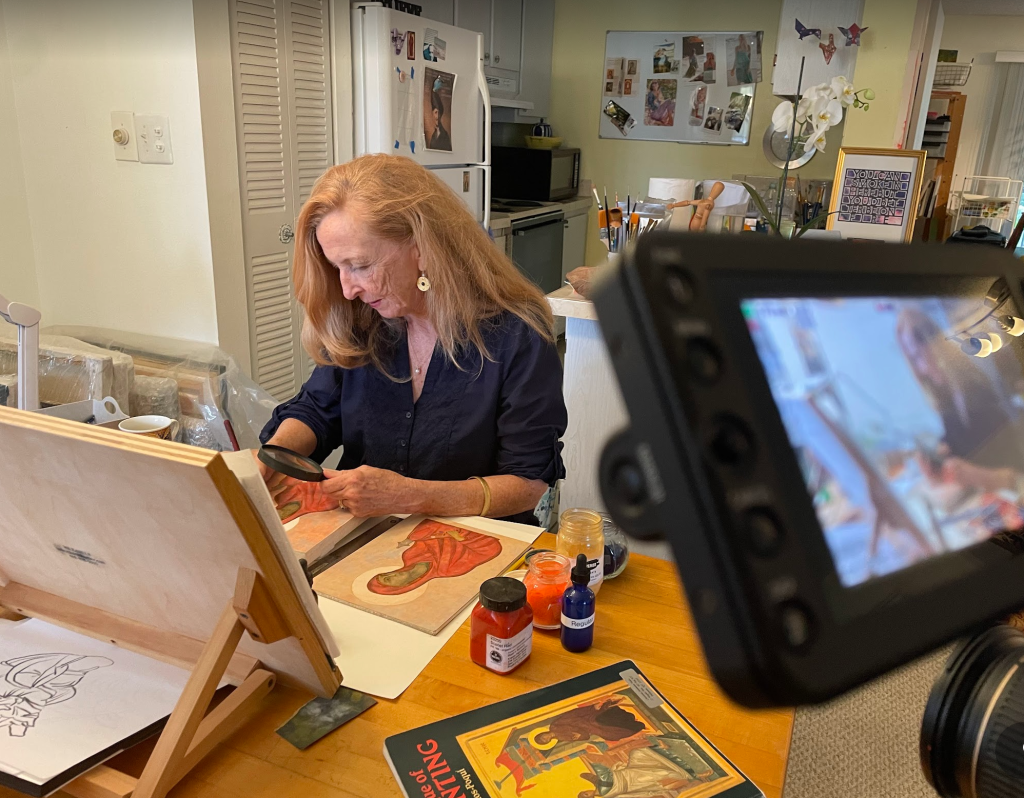 Well, the exciting news in March was the filming of Christine in her icon studio by a PBS film crew, for a national spot on ‘Arts Plus.’ As this is being written the editing is underway. We do not know yet when it will be aired, but will be sure to provide a link, when that is available.